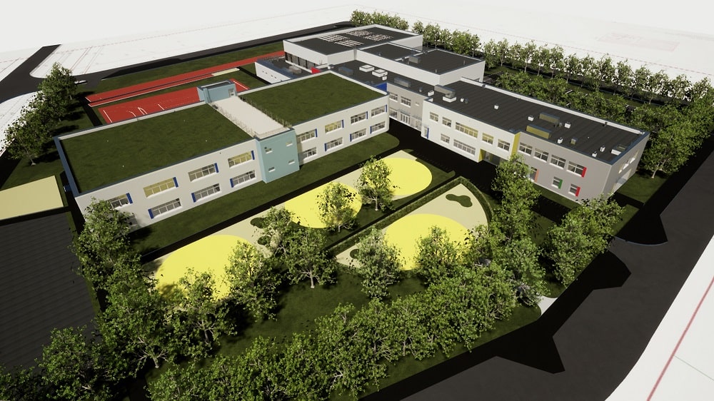 Część szkolna projektu pomieści 650 uczniów w 26 oddziałach oraz 50 dzieci w 2 oddziałach przedszkolnych tzw.”0”. W tym obszarze znajdziemy nie tylko funkcjonalne szatnie i sklepik szkolny, ale również 3 świetlice szkolne (pomiędzy pomieszczeniami przewidziano ścianki mobilne dające możliwość łączenia poszczególnych świetlic), 2 pomieszczenia dla oddziałów dzieci sześcioletnich, 10 sal dla uczniów klas I-III, salę komputerową dla klas I-III, pomieszczenie gospodarcze oraz ustępy dla dzieci i personelu.