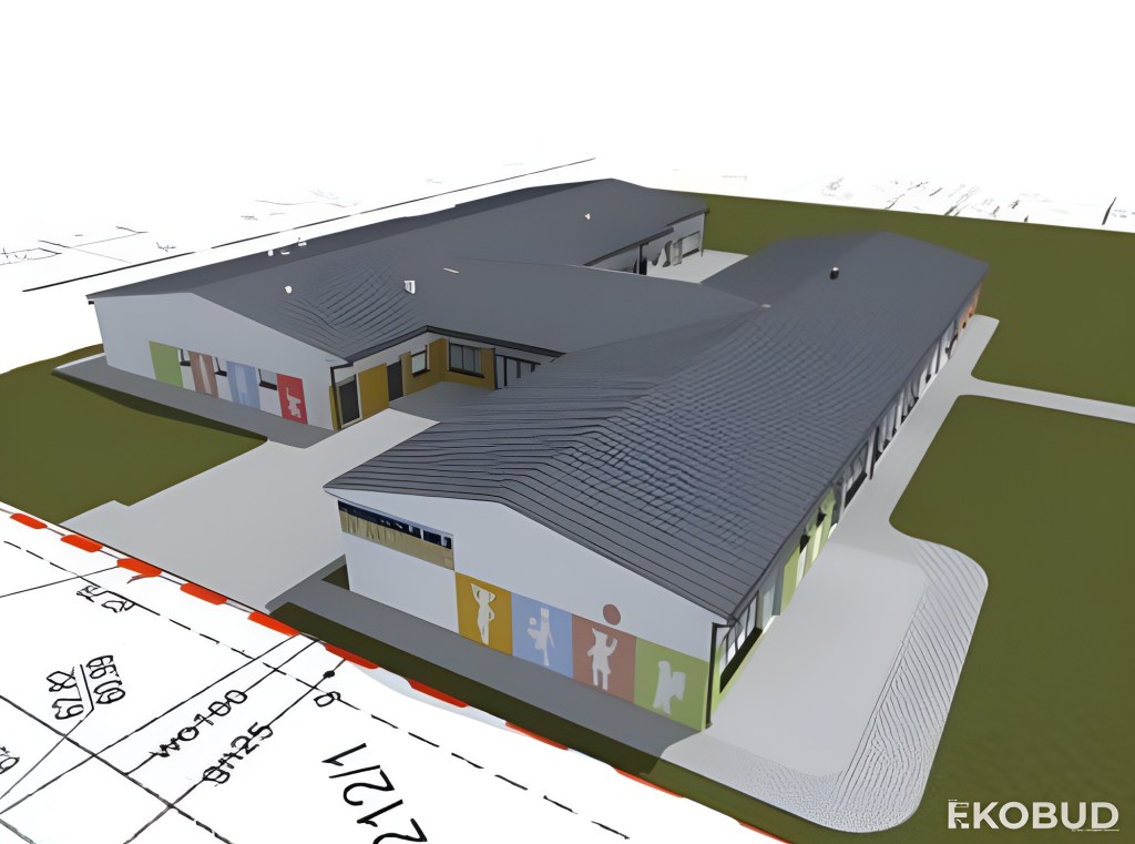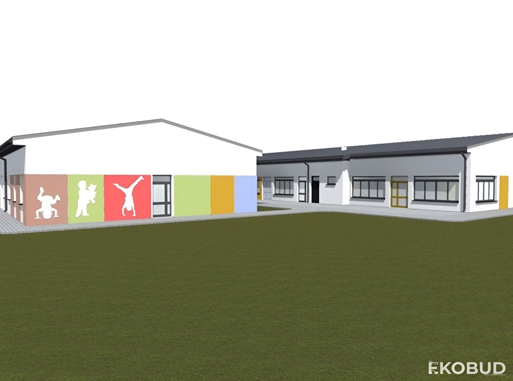 Projekt architektoniczny przedszkola koresponduje z istniejącymi obiektami w otoczeniu, harmonijnie wpisując się w krajobraz. Kolorystyka budynków, utrzymana w pastelowych odcieniach zieleni, żółci, niebieskiego i różowego, stanowi subtelny akcent podkreślający funkcję obiektu.