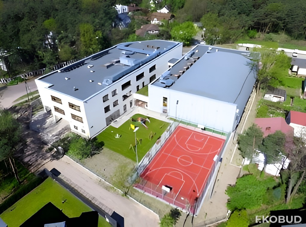 Obiekt został zorganizowany w taki sposób, aby spełniać dwie główne funkcje – szkolną i sportową. Część szkolna prezentuje się jako trzykondygnacyjny budynek, natomiast część sportowa obejmuje dwie kondygnacje z nowoczesną salą gimnastyczną, którą nakrywa efektowny dach soczewkowy.