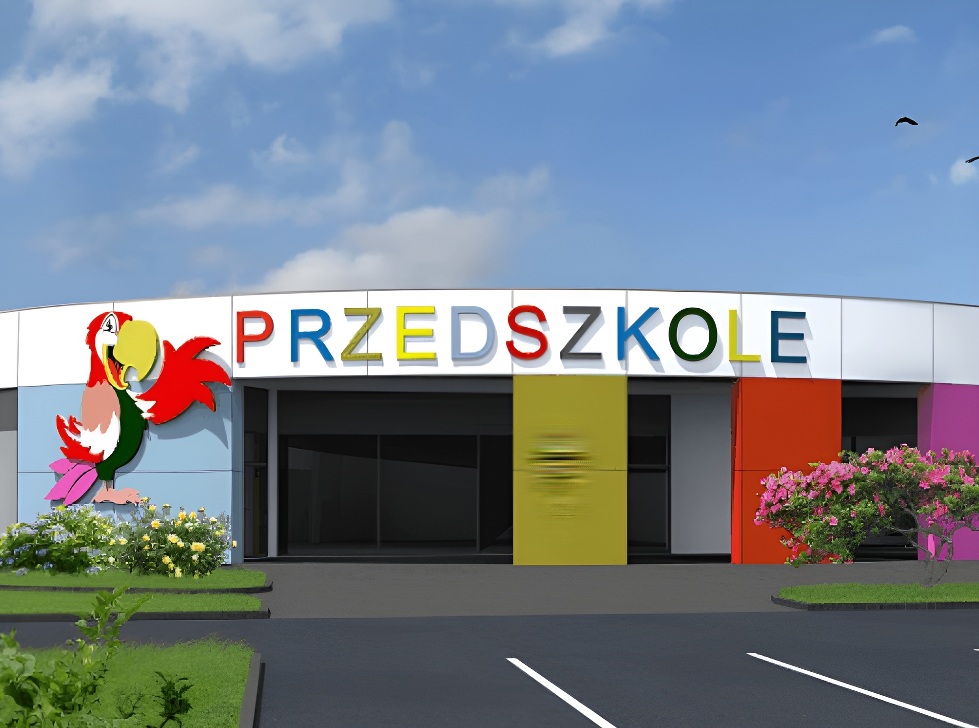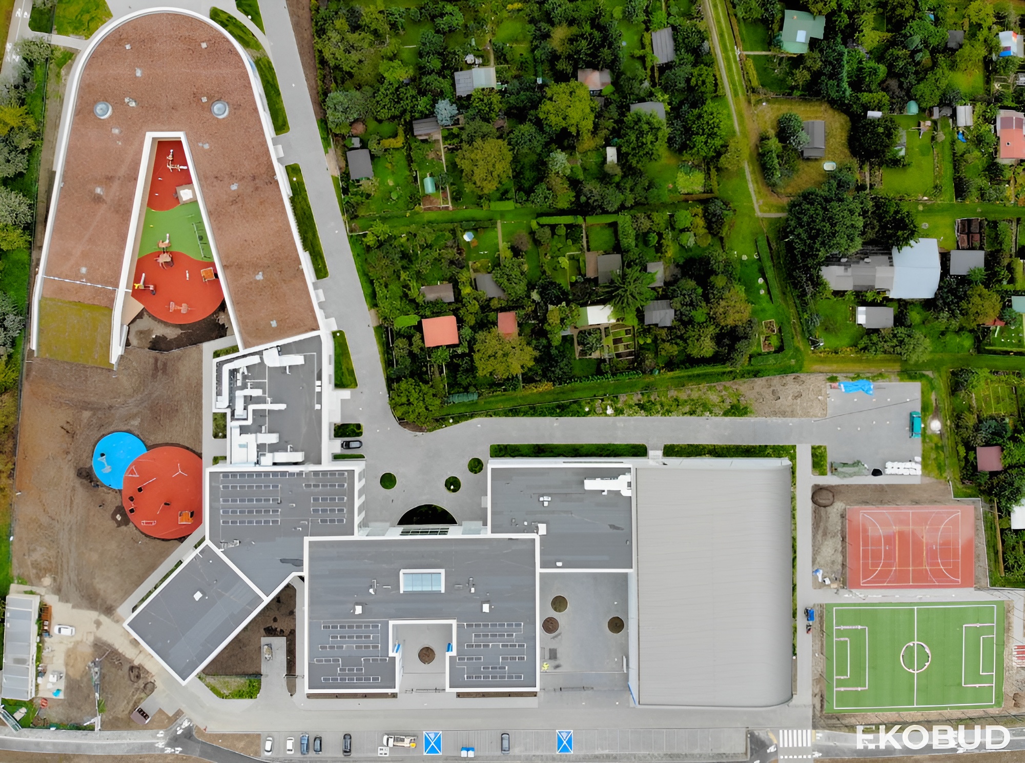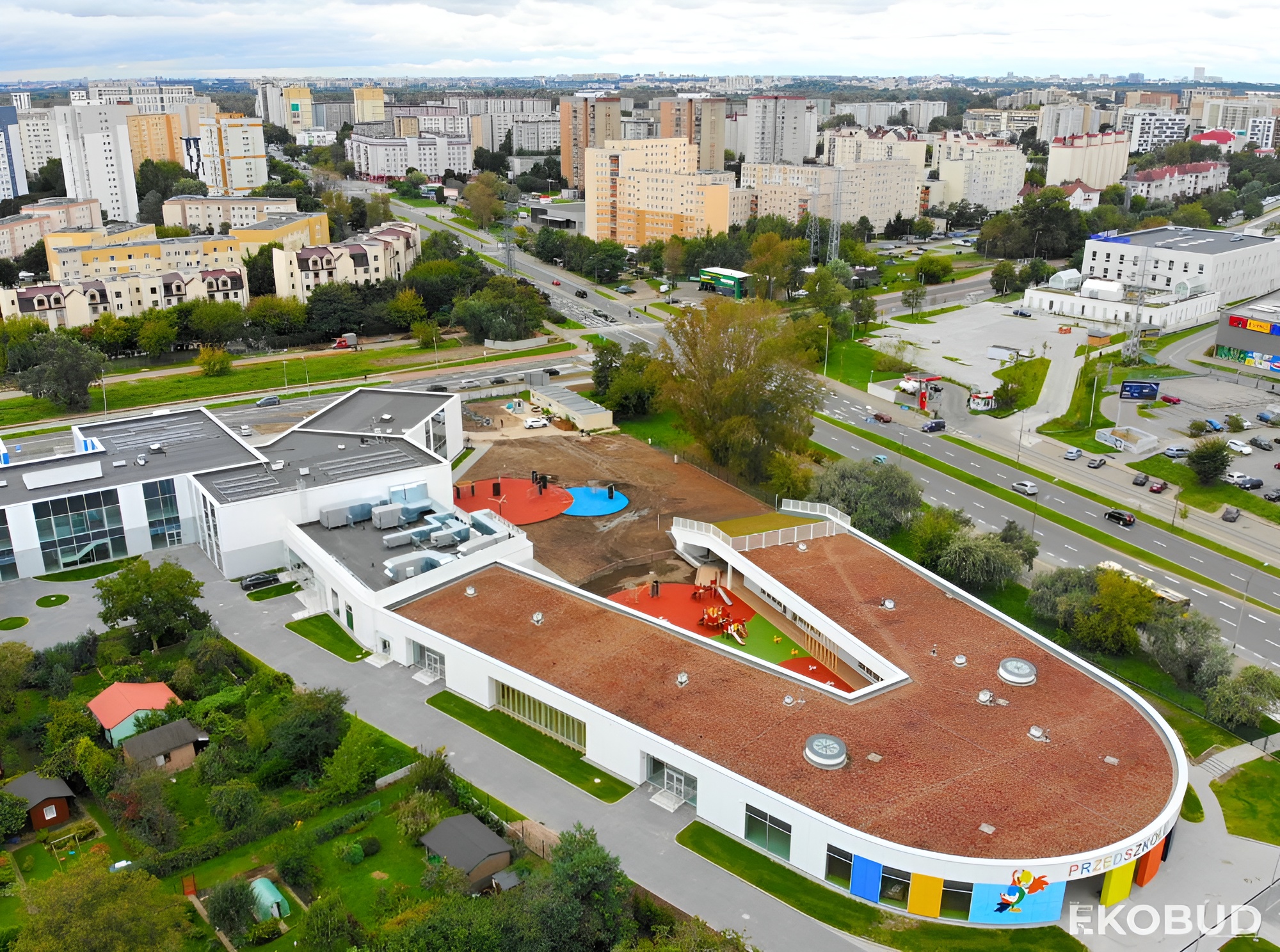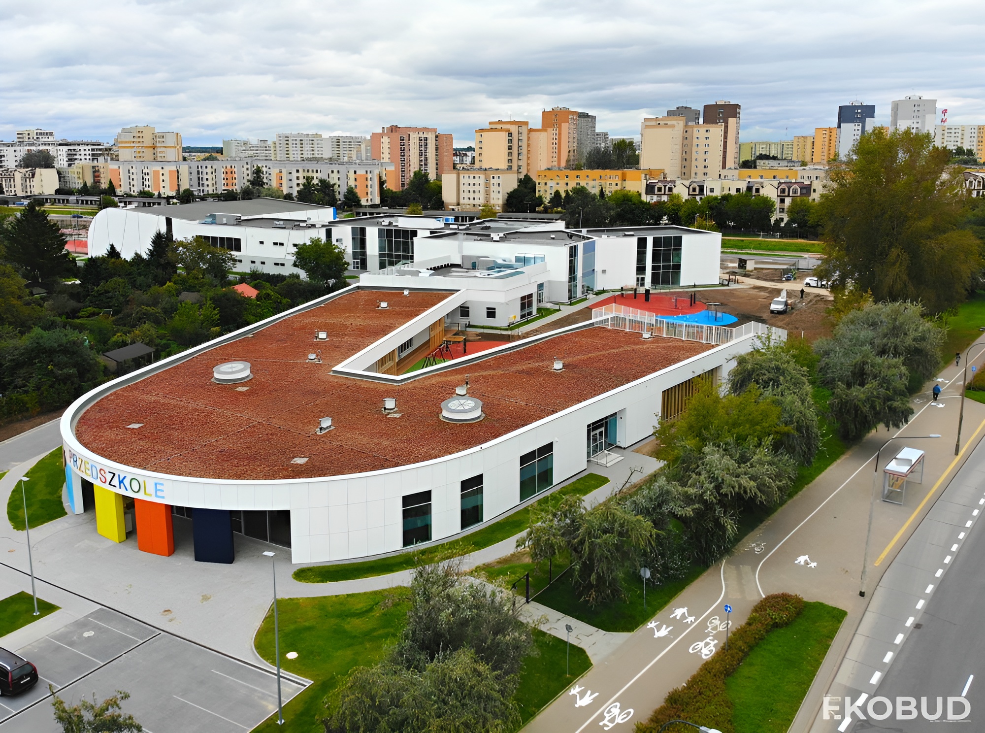 Na części przedszkolnej projektuje się dach zielony, przechodzący płynnie w plac zabaw podzielony na strefy dla różnych grup wiekowych, tworząc inspirującą i funkcjonalną przestrzeń dla najmłodszych.